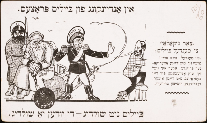 “In Memory of the Beilis Trial: Beilis Not Guilty, Jews Guilty.” Yiddish postcard. Artwork by Mitchel Loeb. Printed by Progress Publishing Company, New York, ca. 1913. (YIVO)