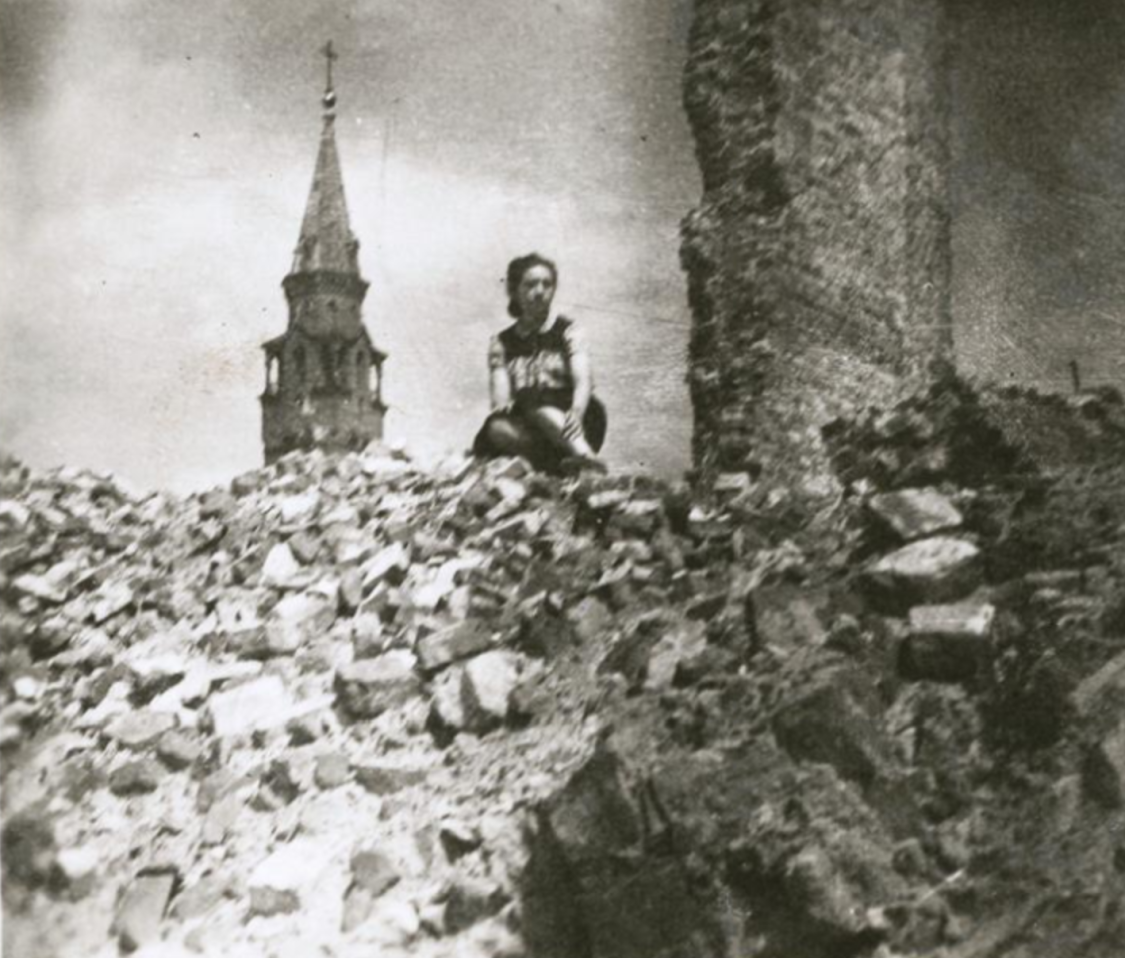 Hannah Fryshdorf, a participant in the Warsaw ghetto uprising, amid the ruins of the ghetto, ca. 1945. YIVO Archives.