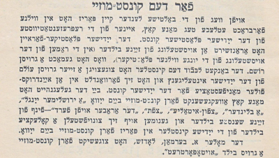 The August-October 1937 issue of Yedies reports on a visit by the artist Emmanuel Mane-Katz. He had stopped off on his way back to Paris from a trip to the Baltic countries and to view an exhibition of his work in Vilna. The article reports on his donation of five of his paintings to YIVO’s art museum and his promise to collect more artworks from Jewish artists in Paris for YIVO.