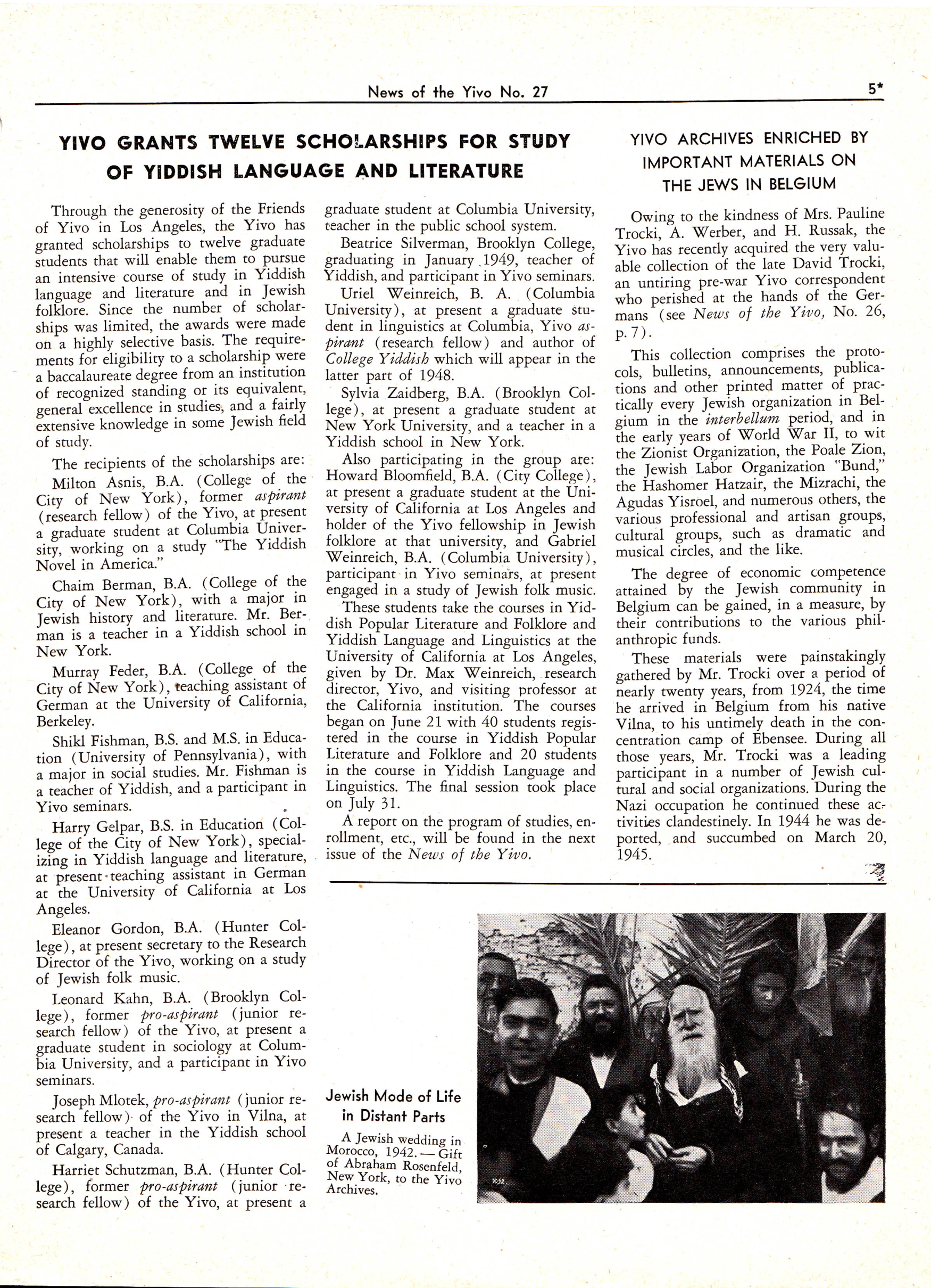 Other scholarship recipients included Shikl (Joshua) Fishman, who would become an eminent linguist; and Uriel Weinreich, Max Weinreich’s son and later Yiddish lexicographer (author of the Yiddish-English, English-Yiddish dictionary that bears his name, for which Chana served as proofreader). Uriel’s future wife, the folklorist Beatrice (Bina) Silverman, and his younger brother, Gabriel, were also enrolled in the course.